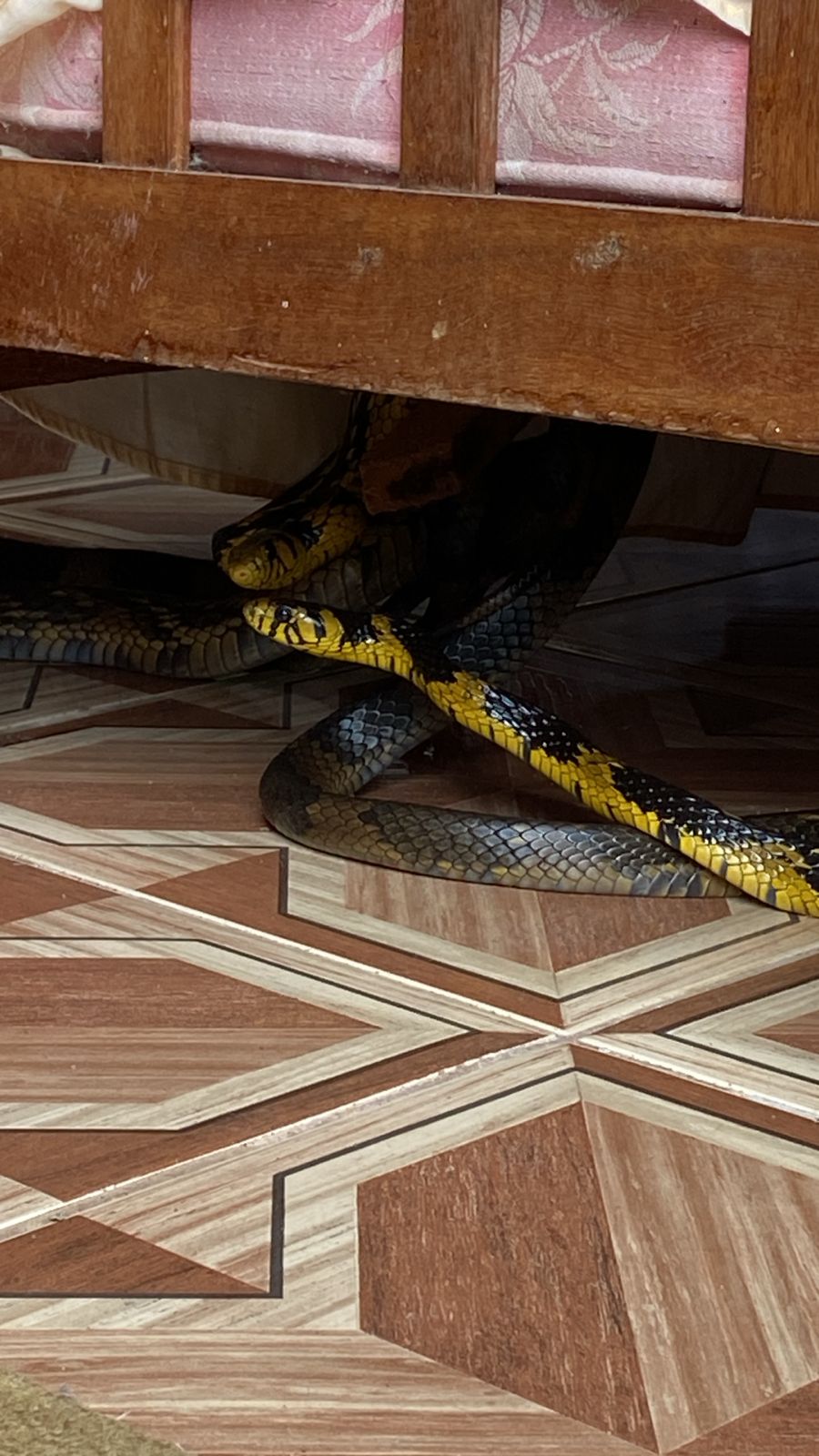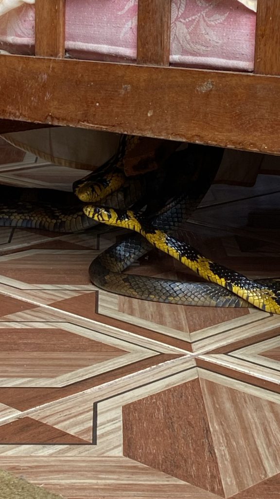 O Instituto Estadual do Ambiente (Inea) resgatou, nesta quinta-feira (24/4), duas cobras Caninanas (Spilotes pullatus) que copulavam embaixo da cama de uma residência no distrito de Lumiar, em Nova Friburgo. A equipe de guarda-parques da Área de Proteção Ambiental Estadual Macaé de Cima que foi acionada por moradores, se deparou com a cena curiosa e realizou a captura dos animais, que foram encaminhados para avaliação médica veterinária e reintroduzidos na natureza logo em seguida.