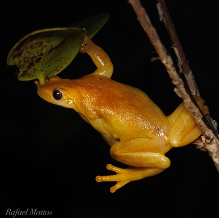 De cor amarela, a perereca-da-fruta (Xenohyla truncata), espécie ameaçada de extinção e que só existe nas restingas do Estado do Rio de Janeiro, foi registrada na Área de Proteção Ambiental Estadual de Maricá (APA Maricá) do Instituto Estadual do Ambiente (Inea), na Região Metropolitana do Rio, no último dia 12.
