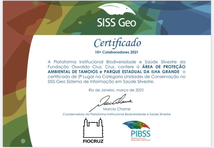 No fim de março, a Área de Proteção Ambiental Estadual de Tamoios e o Parque Estadual da Ilha Grande, administrados pelo Instituto Estadual do Ambiente (Inea), conquistaram o 5° lugar na categoria Unidades de Conservação na premiação dos 10+ Colaboradores do Sistema de Informação em Saúde Silvestre (Siss-Geo) 2021 da Fiocruz.