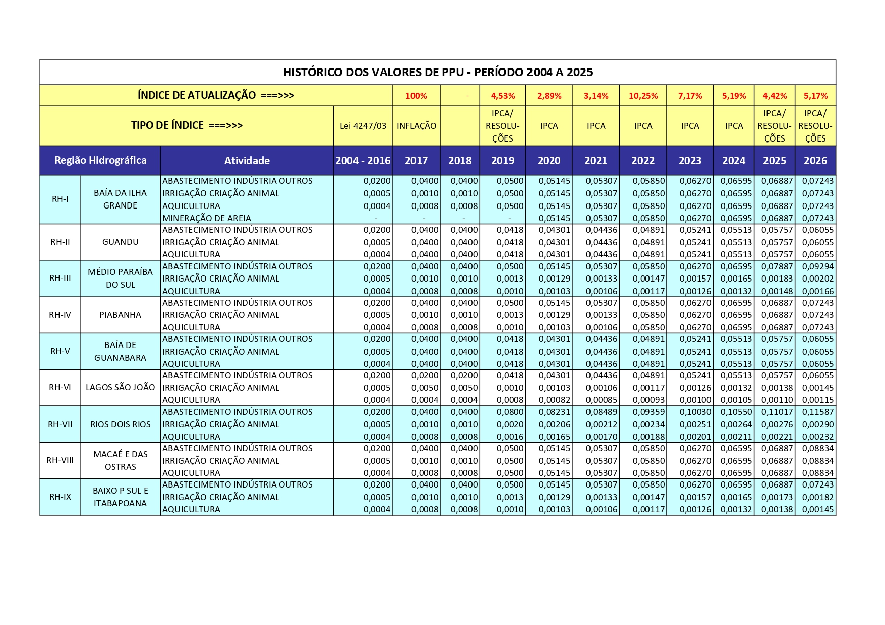 A tabela abaixo apresenta a evolução dos valores do PPU até hoje, por Região Hidrográfica e Finalidade de uso.