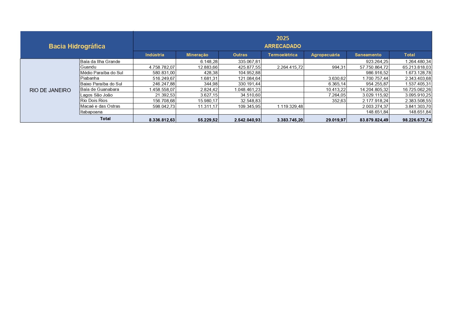 Arrecadação por Região Hidrográfica/Setor Usuário