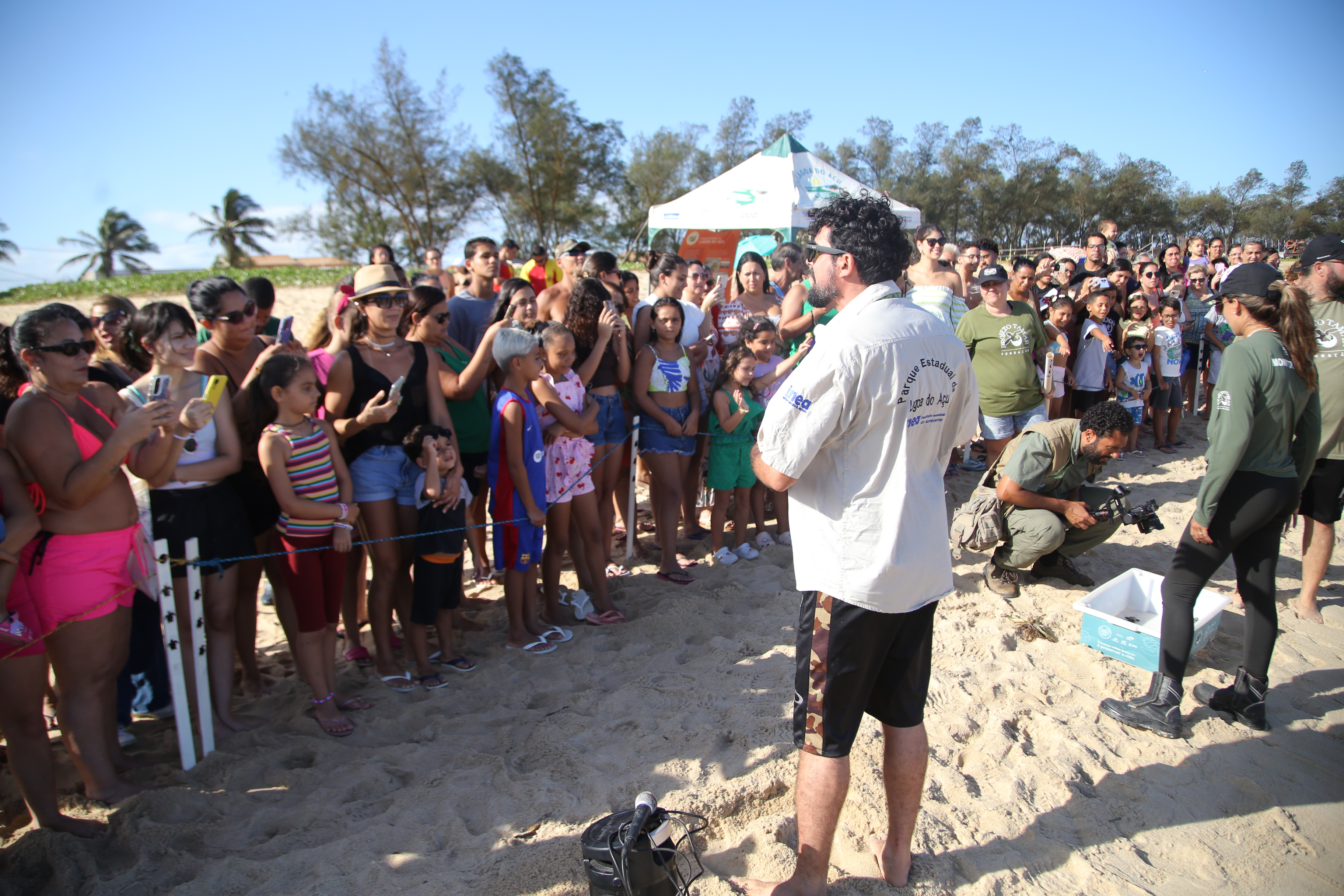 Durante o entardecer desta sexta-feira (10/1) na Praia do Farol de São Tomé, em Campos dos Goytacazes, 20 filhotes de tartarugas-cabeçudas (Caretta caretta) puderam chegar ao mar em segurança com o apoio das equipes do Parque Estadual da Lagoa do Açu, administrado pelo Inea, do Projeto Tamar e da Reserva Caruara. A caminhada dos animais, de espécie ameaçada de extinção, reuniu quase 200 pessoas, entre moradores e turistas, em um dos principais pontos da cidade.