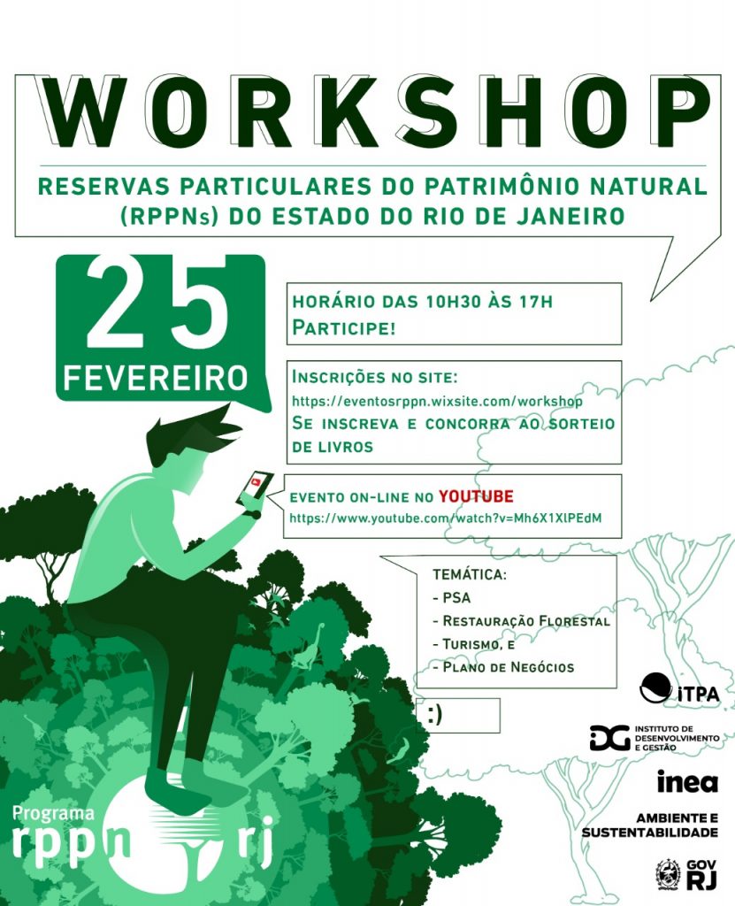 Na quinta-feira que vem, dia 25/02, das 10h30 até 17h pelo Youtube, acontecerá o Workshop online sobre as Reservas Particulares de Patrimônio Natural do Estado do Estado do Rio de Janeiro. Ao realizar a inscrição no link abaixo, você aprenderá sobre temáticas como PSA, Restauração Florestal, Turismo e Plano de Negócios, além disso, ainda concorre ao sorteio de livros.