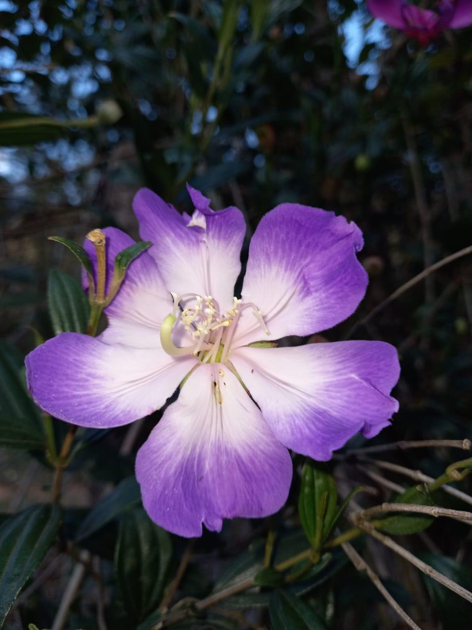 A curiosa mudança na coloração das pétalas da espécie Pleroma mutabile tem uma explicação: a cor branca com as bordas levemente arroxeadas significa que a plantinha é jovem e rica em pólen. À medida que envelhece, muda para a cor rosa até chegar ao totalmente roxo, indicando que o pólen também está chegando ao fim.