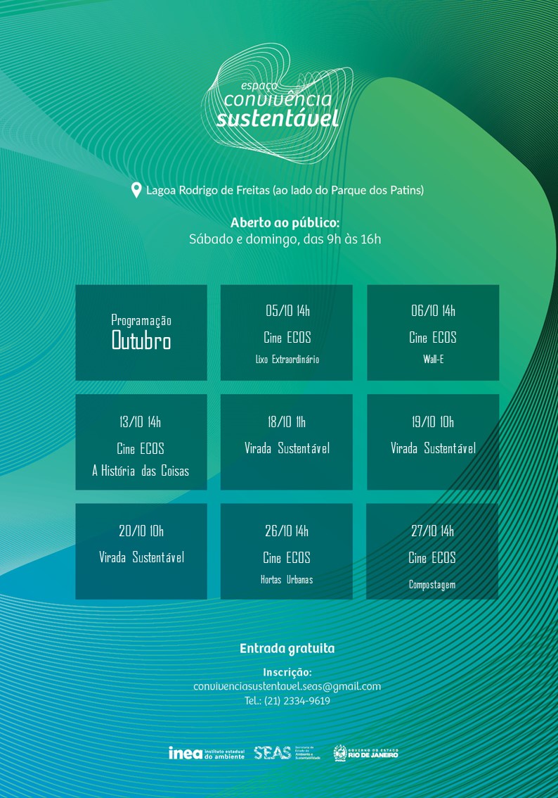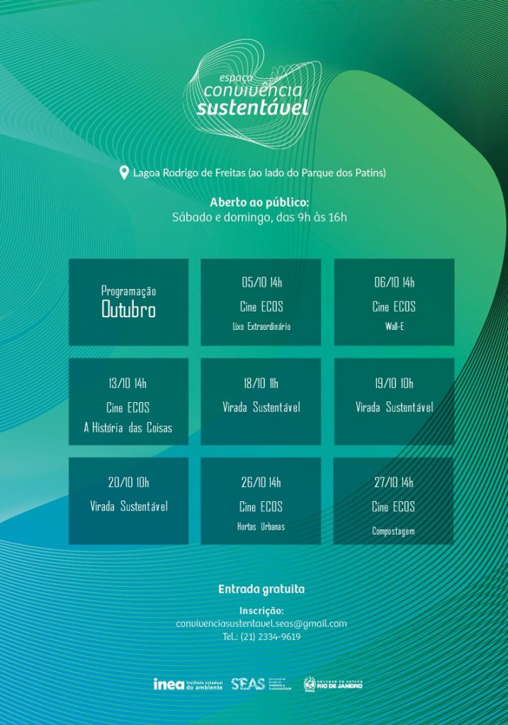 A programação inclui ainda a exibição dos filmes “A História das Coisas” (13/10), além de oficinas sobre hortas urbanas (26/10) e de compostagem (27/10), as atividades iniciarão às 14h. As vagas são limitadas e, para participar, é necessária a inscrição por e-mail (convivenciasustentavel.seas@gmail.com) ou pelo telefone (21) 2334-9619.