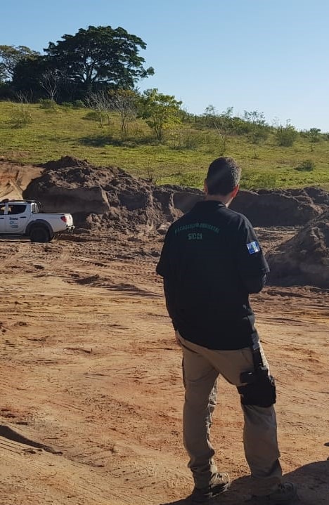 No segundo ponto vistoriado, os técnicos flagraram extração de terra sem o devido licenciamento. Duas máquinas e um caminhão foram apreendidos e duas pessoas foram multadas e também conduzidas à 42ª D.P.