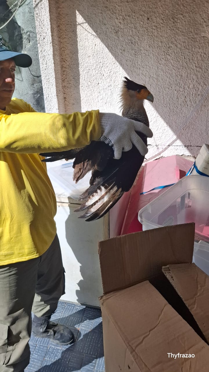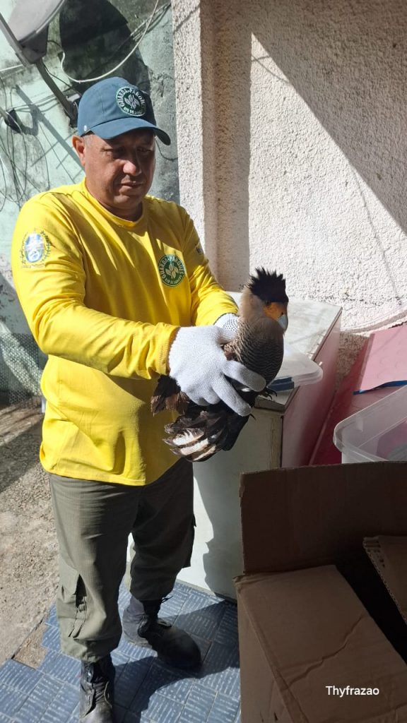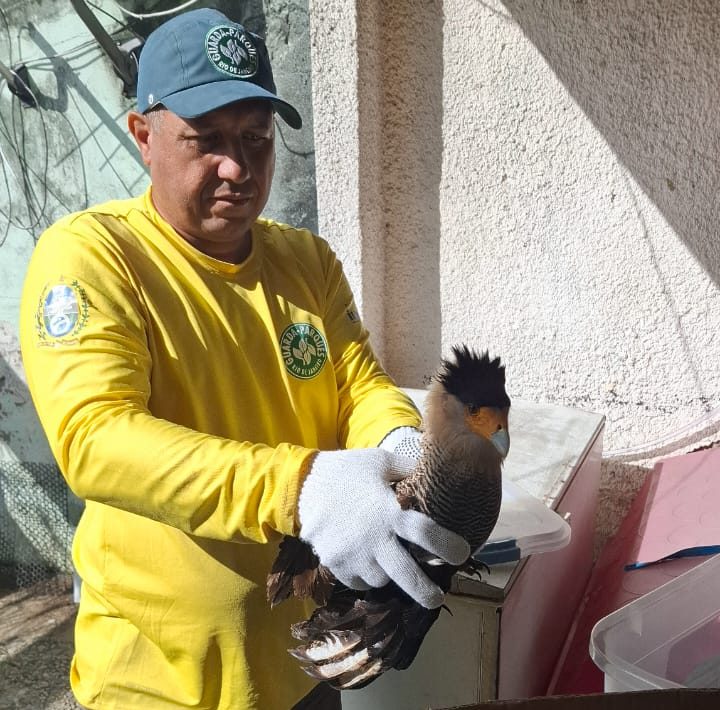 Um gavião da espécie carcará (Caracara plancus), macho e adulto, foi resgatado nesta quarta-feira (25/6), por guarda-parques do Instituto Estadual do Ambiente (Inea) nas proximidades do Parque Estadual do Mendanha, em Campo Grande, na zona oeste da cidade. O animal foi encontrado por um morador quando chegava em casa, na Rua Edgar Duque Estrada que, imediatamente, acionou o órgão ambiental estadual.