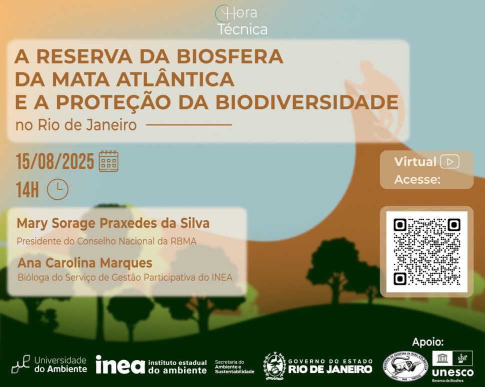 A Hora Técnica será conduzida por Mary Sorage Praxedes da Silva, presidente do Conselho Nacional da RBMA, bióloga, professora universitária e gestora do Parque Estadual das Dunas, no Rio Grande do Norte; e por Ana Carolina Marques, bióloga e servidora do Inea, com mestrado em desenvolvimento sustentável pela UFRRJ e atuação no Serviço de Gestão Participativa da Gerência de Unidades de Conservação (SERVGP/GERUC/DIRBAPE).