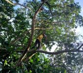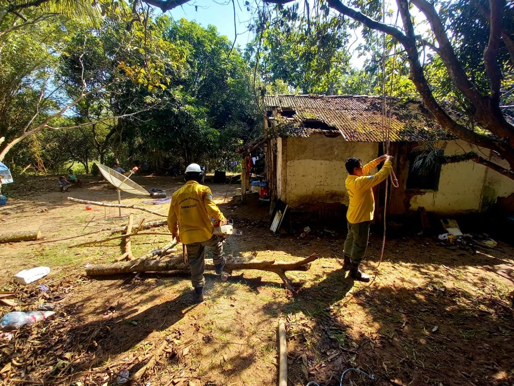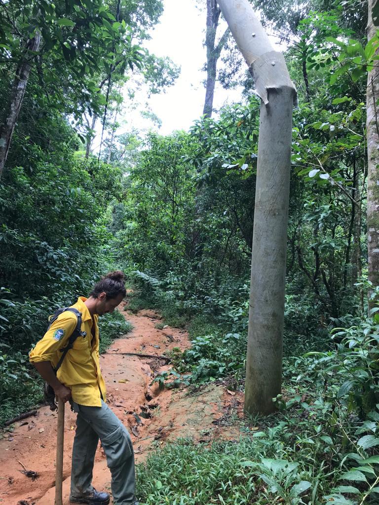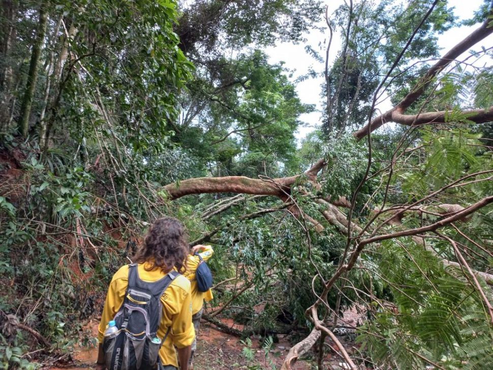 A equipe trabalha na retirada das árvores que caíram por conta da tempestade, e na reconstrução das trilhas destruídas pelo deslizamento.