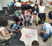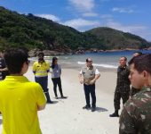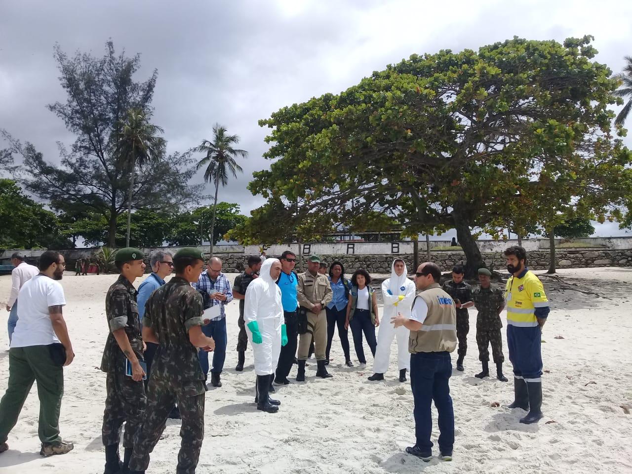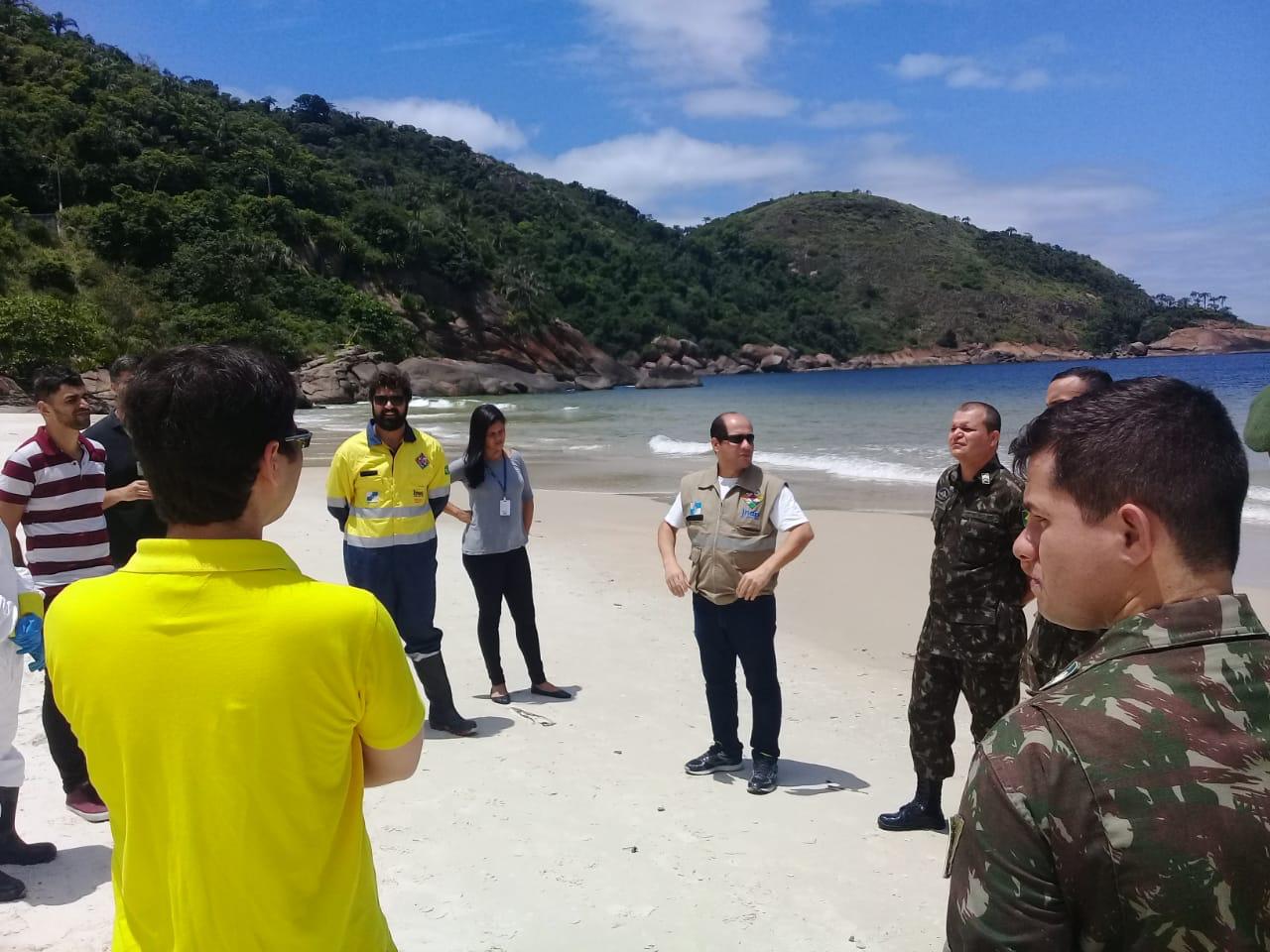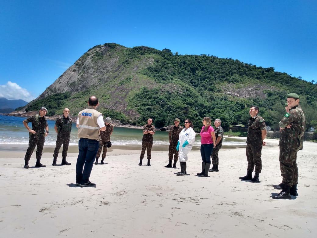 Na parte da manhã, a capacitação foi realizada em uma praia do Forte do Imbuhy, do Exército, localizado em Niterói. O grupo aprendeu como proceder com a aproximação de mancha de óleo e retirada adequada do produto, bem como sobre a logística para a disposição temporária do resíduo oleoso.