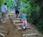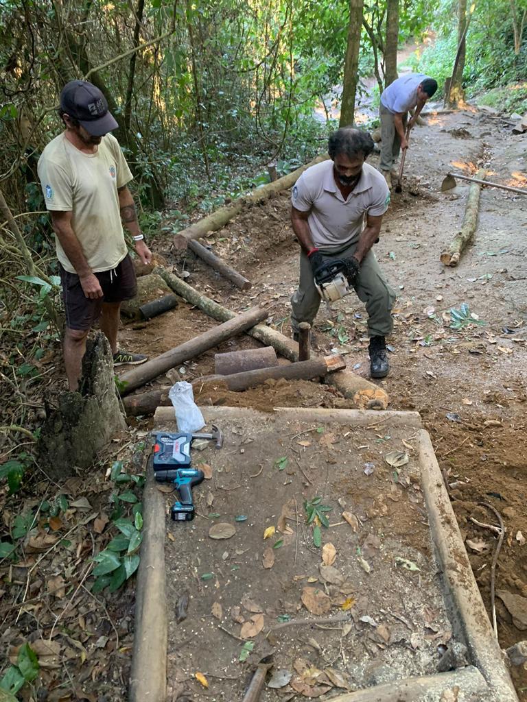 Durante a primeira etapa, em abril, voluntários levaram troncos de eucalipto para a confecção de novas escadas que, ontem, finalmente puderam ser instaladas. O intuito é facilitar o acesso a alguns trechos da trilha de 1km que leva para uma das praias mais belas de todo o mundo.