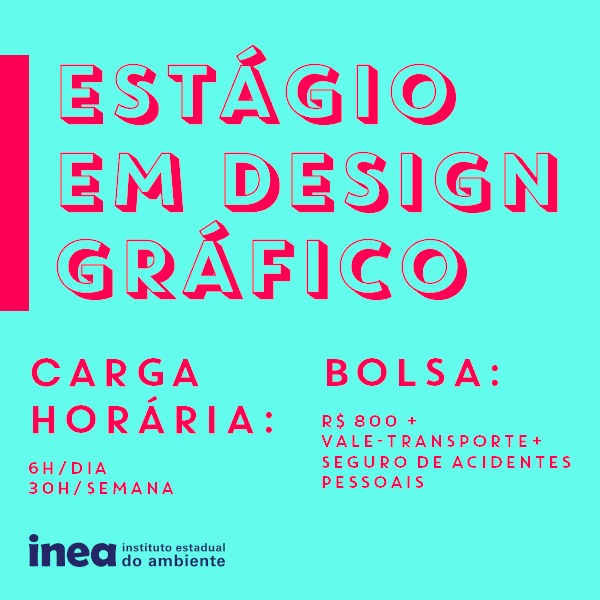 O Instituto Estadual do Ambiente (Inea), por meio da Gerência de Publicações e Acervo Técnico (Gerpat), divulga, nesta sexta-feira (26/11), vaga de estágio em Design Gráfico para estudantes que estão entre o 4º e o 7º período da graduação. Podem se candidatar até o dia 10/12 alunos dos cursos de Design Gráfico, Desenho Industrial ou Comunicação Visual.