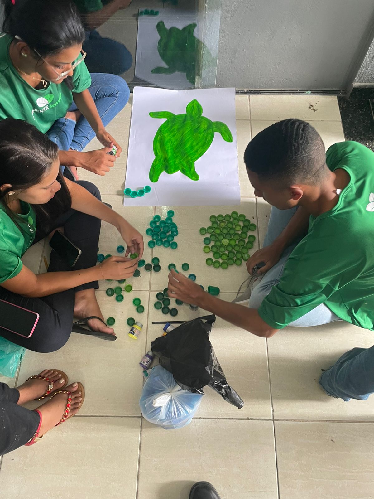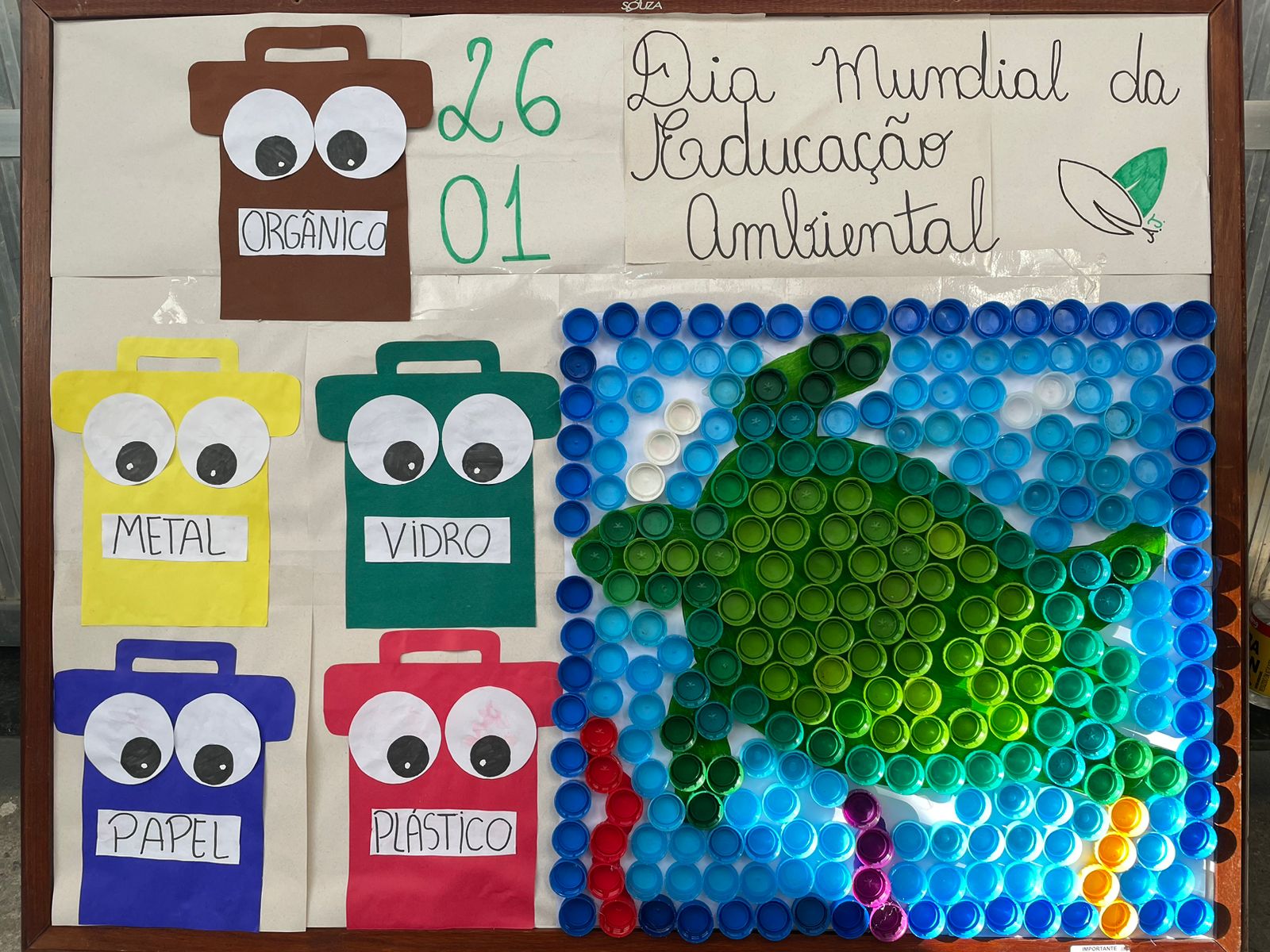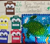 Além da parte teórica, os alunos também participaram de uma oficina de reaproveitamento de materiais recicláveis e confeccionaram um quadro a partir de tampinhas de garrafa pet.