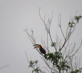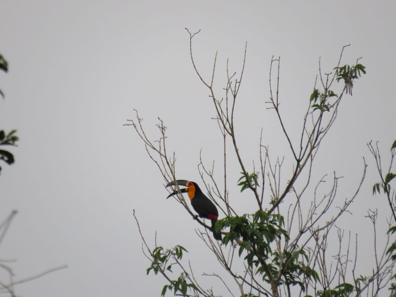 Já o tucano de bico-preto (Ramphastos vitellinus) foi avistado na copa de árvores da trilha do Curumim, bem próximo à sede da unidade de conservação, área onde está ocorrendo o enriquecimento com mudas da palmeira juçara, um dos alimentos dessa ave.
