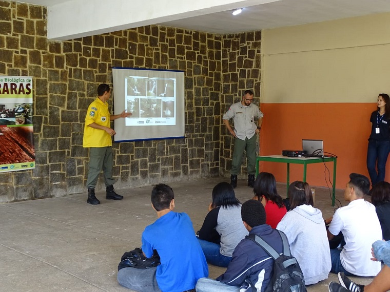 Profissionais da Rebio Araras visitaram a Escola Estadual Embaixador José Bonifácio, em Petrópolis, e promoveram palestras sobre as unidades de conservação, prevenção a incêndios florestais. Os estudantes também participaram de um plantio de mudas de espécies nativas da Mata Atlântica no jardim da unidade de ensino.