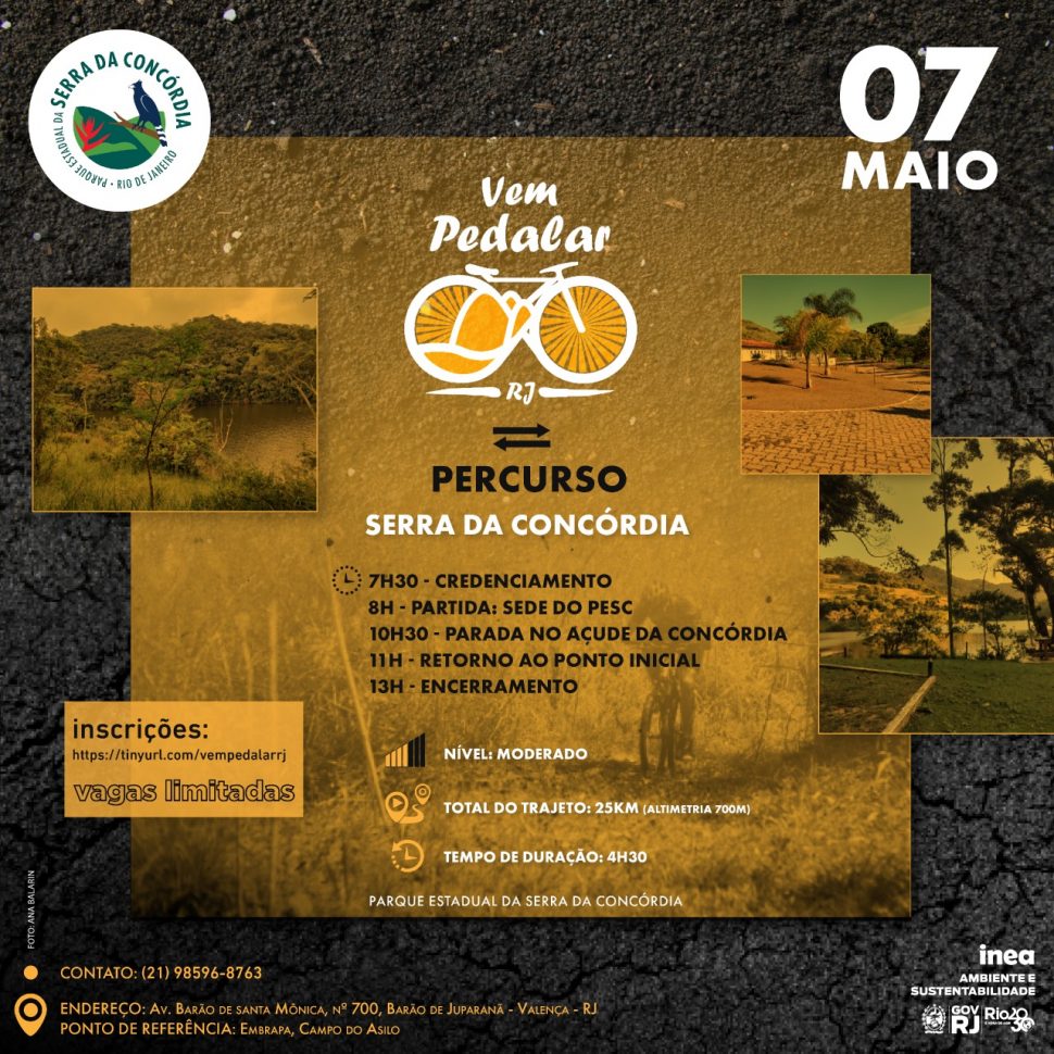 No próximo dia 7/5, o Instituto Estadual do Ambiente (Inea) promoverá mais uma edição do programa Vem Pedalar RJ, com ponto de encontro na sede do Parque Estadual da Serra da Concórdia (PESC), em Valença. O evento, que tem como objetivo estimular a visitação da comunidade às unidades de conservação por meio de passeios ciclísticos, contará com um percurso de nível moderado de 25 km.