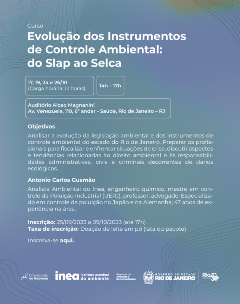 O Instituto Estadual do Ambiente (Inea), por meio da Universidade do Ambiente, irá promover nos dias 17, 19, 24 e 26/10 o curso Evolução dos Instrumentos de Controle Ambiental: do SLAP ao SELCA. A capacitação acontecerá no auditório Alceo Magnanini, no 6° andar da sede dos órgãos ambientais estaduais, no Centro do Rio de Janeiro, e as inscrições vão até 9/10.