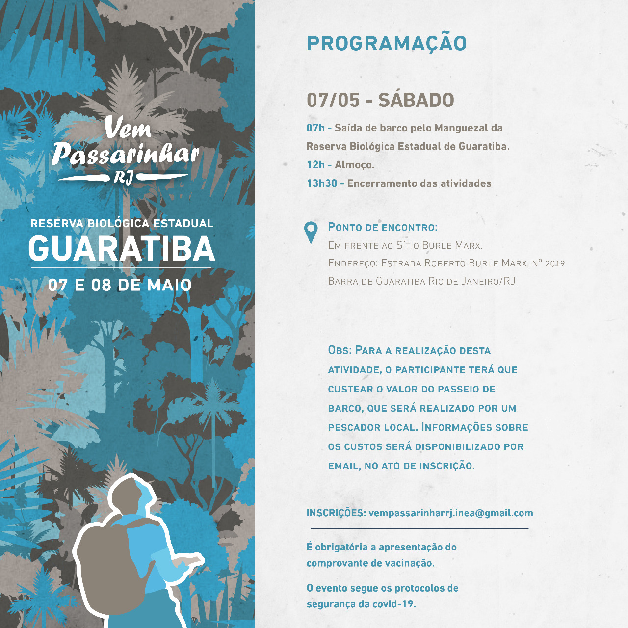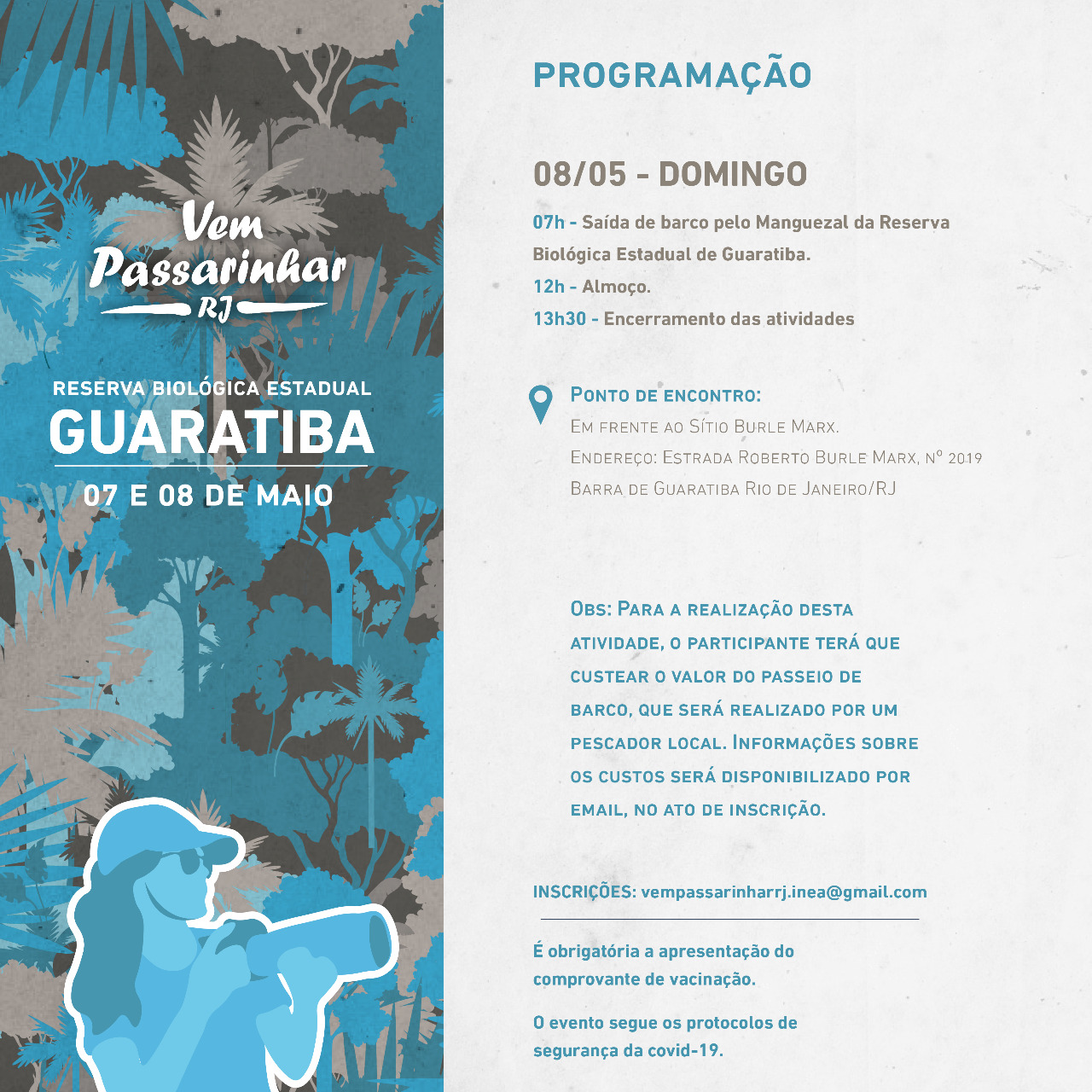 O evento deste fim de semana contará também com passeio de barco pelo manguezal da reserva para a observação de aves. Os interessados devem se inscrever por meio do email vempassarinharrj.inea@gmail.com com o comprovante de vacinação contra a COVID-19.