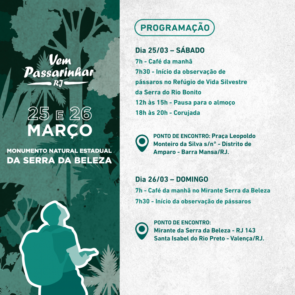 Nos dias 25 e 26/3, o Monumento Natural Estadual da Serra da Beleza, no distrito de Amparo, em Barra Mansa, irá sediar a próxima edição do programa Vem Passarinhar RJ. Idealizado pelo Instituto Estadual do Ambiente (Inea), o programa visa sensibilizar acerca da importância da avifauna por meio de sua observação nas unidades de conservação, além de estimular o contato com a natureza e a vida saudável.