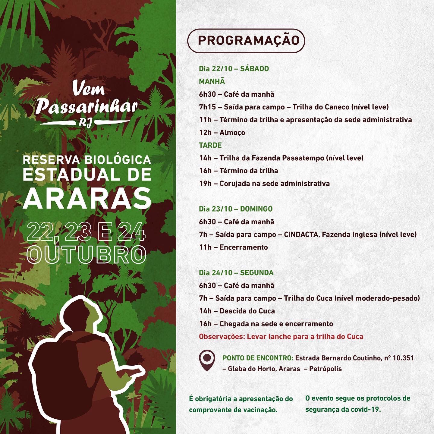 Nos próximos dias 22, 23 e 24/10, a Reserva Biológica Estadual de Araras, localizada na Região Serrana Fluminense, irá sediar mais uma edição do programa Vem Passarinhar RJ. Idealizado pelo Instituto Estadual do Ambiente (Inea), o programa visa sensibilizar acerca da importância da avifauna por meio de sua observação nas unidades de conservação, além de estimular o contato com a natureza e a vida saudável.