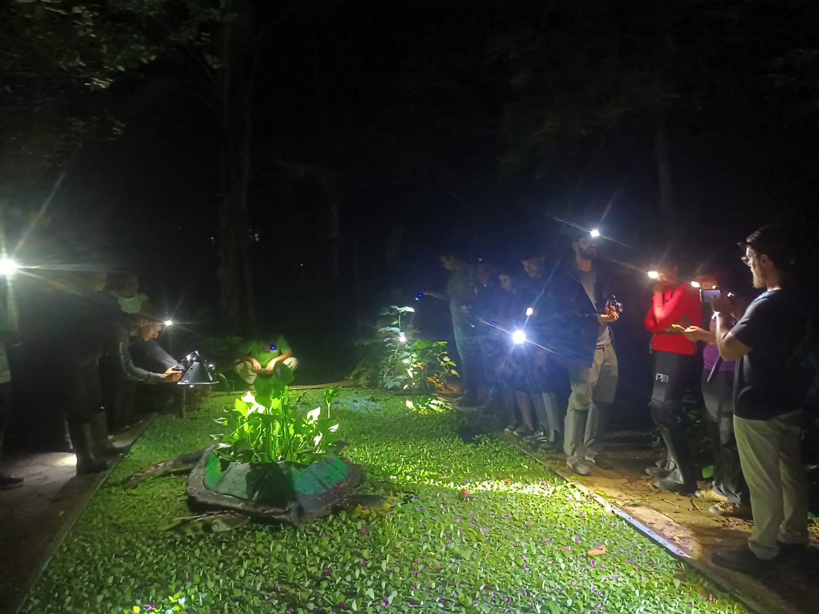 Ao todo, cerca de 11 espécies foram avistadas ou identificadas por vocalização durante a atividade. Entre elas, a Perereca ampulheta ( Dendropsophus minutus), sapo cururuzinho (Rhinella ornata), sapo martelo (Boana faber), rãzinha do folhiço (Physalaemus signifer), rã do folhiço ( Leptodactylus spixi), perereca das folhagens (Pithecopus rhodei), perereca macaco (Phyllomedusa burmeisteri), rãzinha do folhiço (Adenomera marmorata), perereca (Scinax sp), lagartixa de parede exótica (Hemidactylus mabouia), corredeira (Dryophylax nattereri).