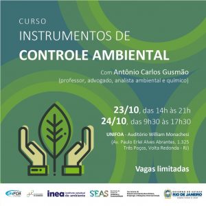 O Instituto Estadual do Ambiente, órgão vinculado à Secretaria de Estado do Ambiente e Sustentabilidade, recebe inscrições para o curso de Instrumentos de Controle Ambiental, realizado pela Universidade do Ambiente, espaço corporativo de aprendizagem do Inea. As aulas ocorrerão nos dias 23/10 (das 14h às 21h) e 24/10 (das 9h30 às 17h30), no auditório da Unifoa, em Volta Redonda.