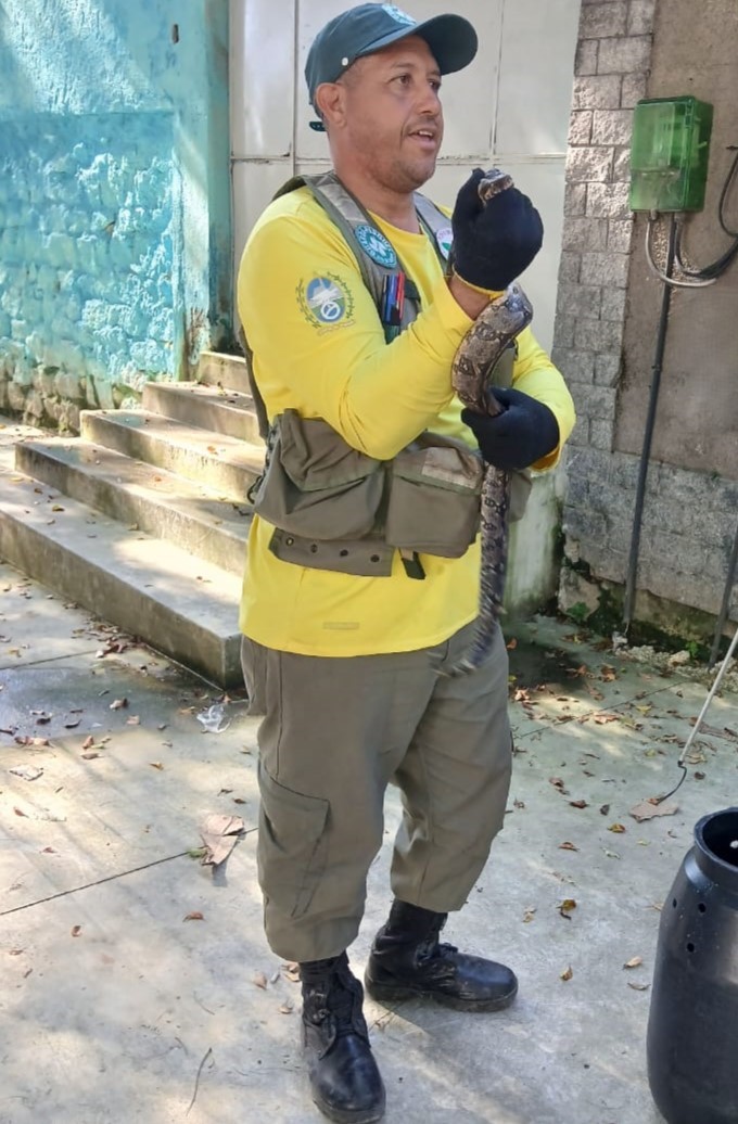Guarda-parques do Instituto Estadual do Ambiente (Inea) realizaram nesta quinta feira (08/05), o resgate de uma jiboia (Boa constrictor) na Avenida Josino Fernandes, em Bangu, Zona Oeste do Rio de Janeiro. O animal foi encontrado por uma moradora na área de serviço de sua casa, onde ela armazenava material de limpeza. Os moradores acionaram a equipe do Parque Estadual da Pedra Branca. Após avaliação veterinária, a serpente foi reintroduzida em seu habitat natural.