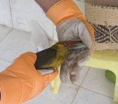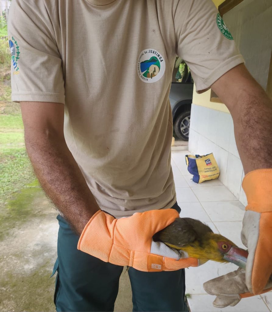 Guarda-parques do Inea foram acionados e, ao chegarem ao local, constataram que o animal apresentava dificuldade para voar e ferimentos após colidir com o vidro de uma janela, segundo relato de moradores da região. A equipe realizou o resgate na localidade da Várzea do Corumbê, conduzindo o atendimento com segurança e cuidado. Após a avaliação inicial, o araçari-banana foi encaminhado ao CRAS, para receber os cuidados veterinários necessários para sua reabilitação.