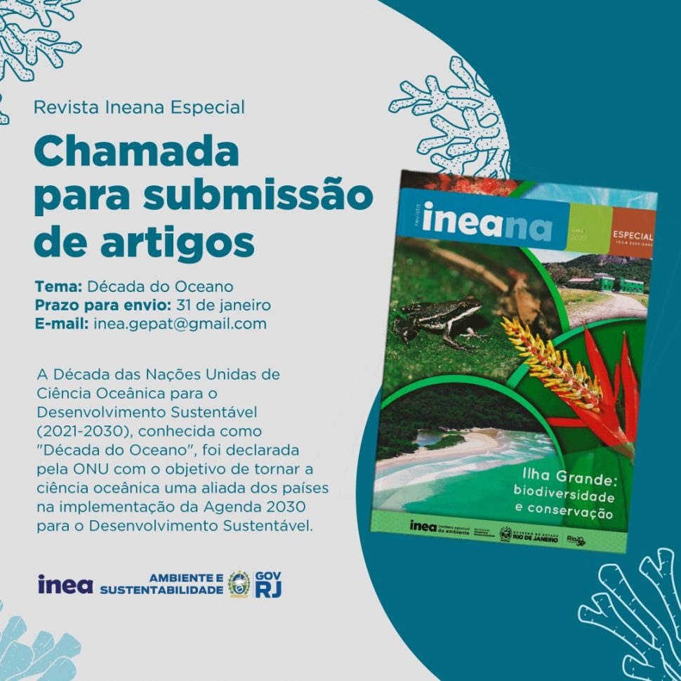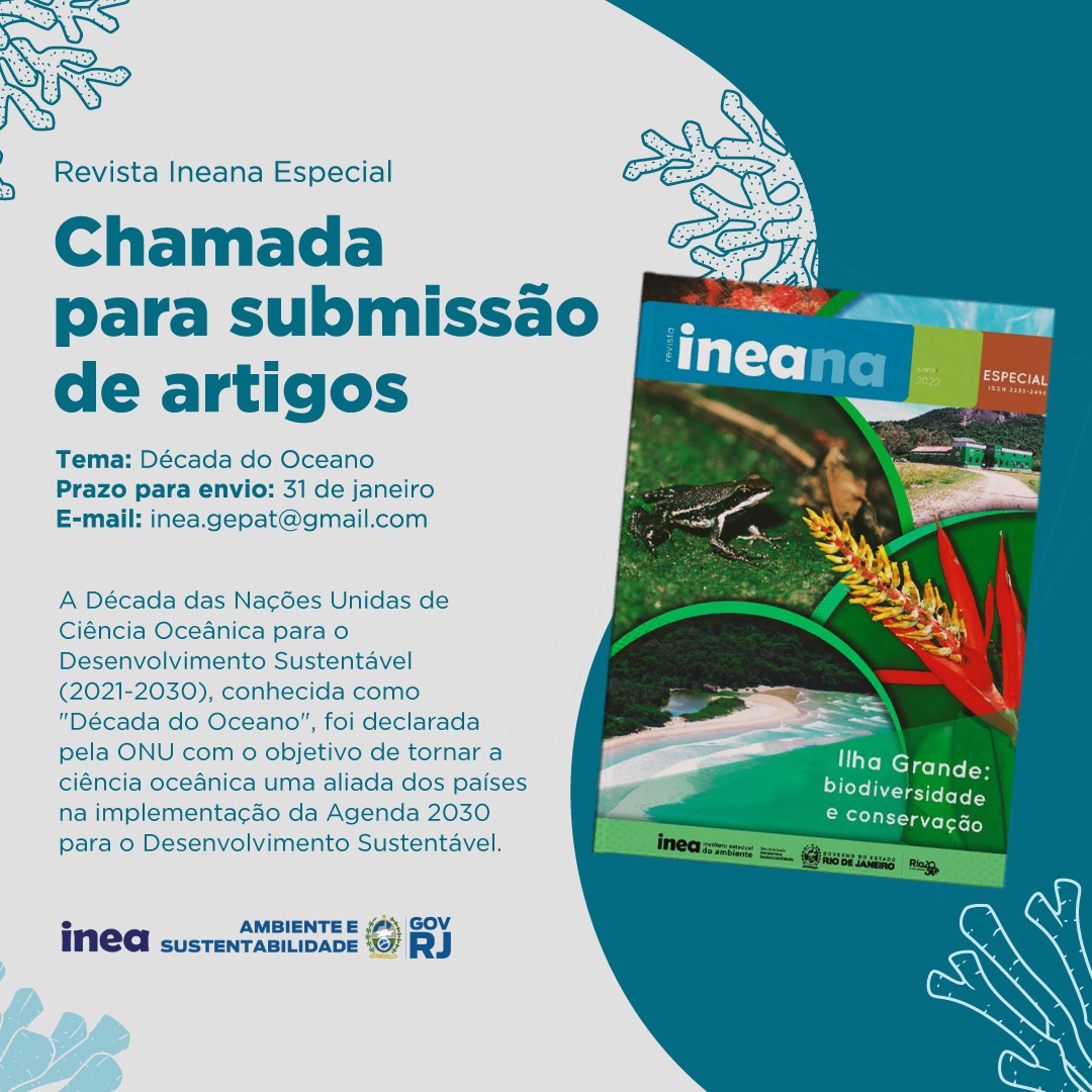 Até 31/1 do próximo ano, a Revista Ineana receberá trabalhos para a edição especial do periódico sobre o tema “Década do Oceano”. Os artigos devem seguir a política editorial e as normas de publicação da revista, e serem enviados para o e-mail: inea.gepat@gmail.com.