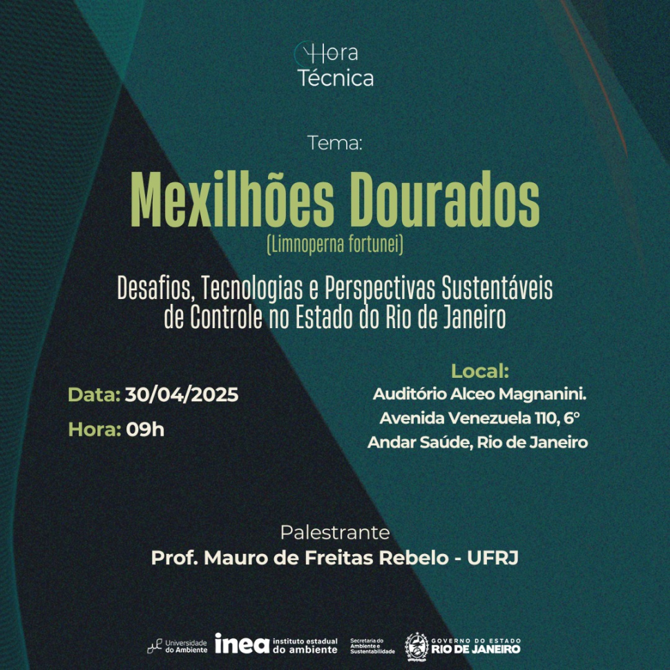 O Instituto Estadual do Ambiente (Inea), por meio da Universidade do Ambiente, convida os servidores para participar da Hora Técnica”Mexilhão-Dourado: Desafios, Tecnologias e Perspectivas Sustentáveis de Controle”, que será realizada no dia 30 de abril de 2025, das 9h às 12h30, no Auditório Alceo Magnanini, na sede do órgão ambiental. O evento abordará os impactos do mexilhão-dourado (Limnoperna fortunei) nos corpos hídricos do estado do Rio de Janeiro, bem como as metodologias mais recentes de controle, incluindo propostas inovadoras em biotecnologia.