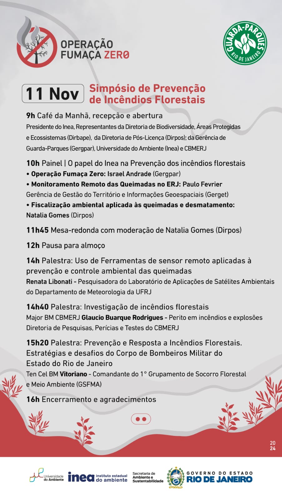 A programação contará com palestras, mesas-redondas e oficinas técnicas, promovendo a troca de conhecimentos entre profissionais da área. Os participantes terão a oportunidade de conhecer estratégias e ações de prevenção e controle de incêndios florestais, alinhadas ao eixo de educação ambiental da Operação Fumaça Zero, campanha promovida anualmente pelo Inea.
