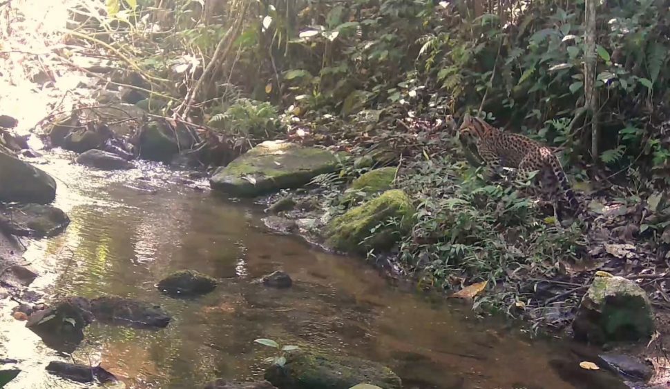A Jaguatirica, animal com ampla distribuição do continente Americano, saiu para caçar e encontrou uma de suas presas favoritas: um Teiú. No vídeo de 18 segundos, é possível ver um indivíduo da espécie caminhando sozinho entre pedras de um riacho. Em seguida, surge segurando um animal morto entre os caninos.