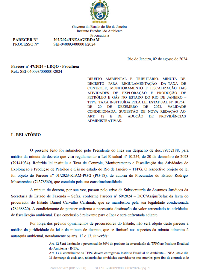 DIREITO AMBIENTAL E TRIBUTÁRIO. MINUTA DE DECRETO PARA REGULAMENTAÇÃO DA TAXA DE CONTROLE, MONITORAMENTO E FISCALIZAÇÃO DAS ATIVIDADES DE EXPLORAÇÃO E PRODUÇÃO DE PETRÓLEO E GÁS NO ESTADO DO RIO DE JANEIRO – TFPG. TAXA INSTITUÍDA PELA LEI ESTADUAL Nº 10.254, DE 20 DE DEZEMBRO DE 2023. VALIDADE CONDICIONADA. SUGESTÃO DE NOVA REDAÇÃO AO ART. 12 E DE ADOÇÃO DE PROVIDÊNCIAS ADMINISTRATIVAS.