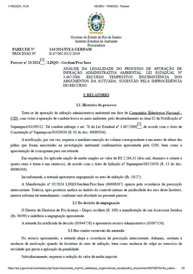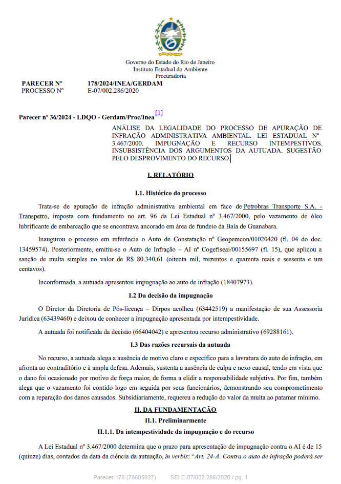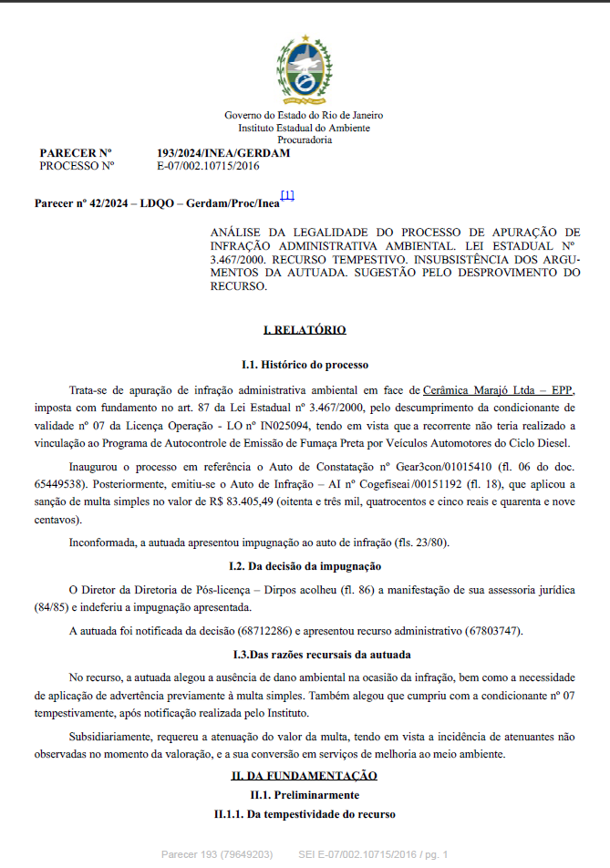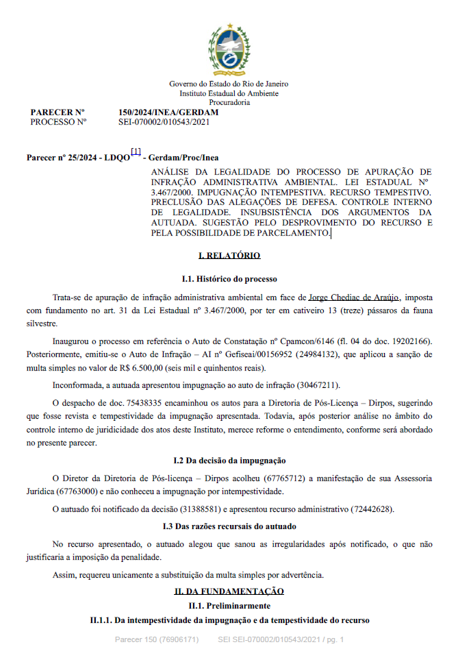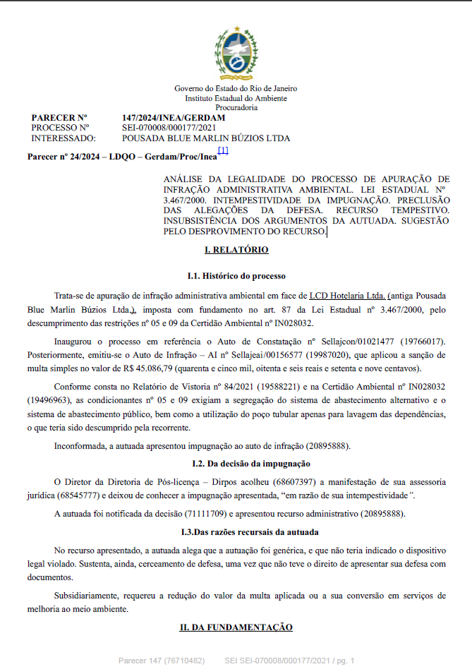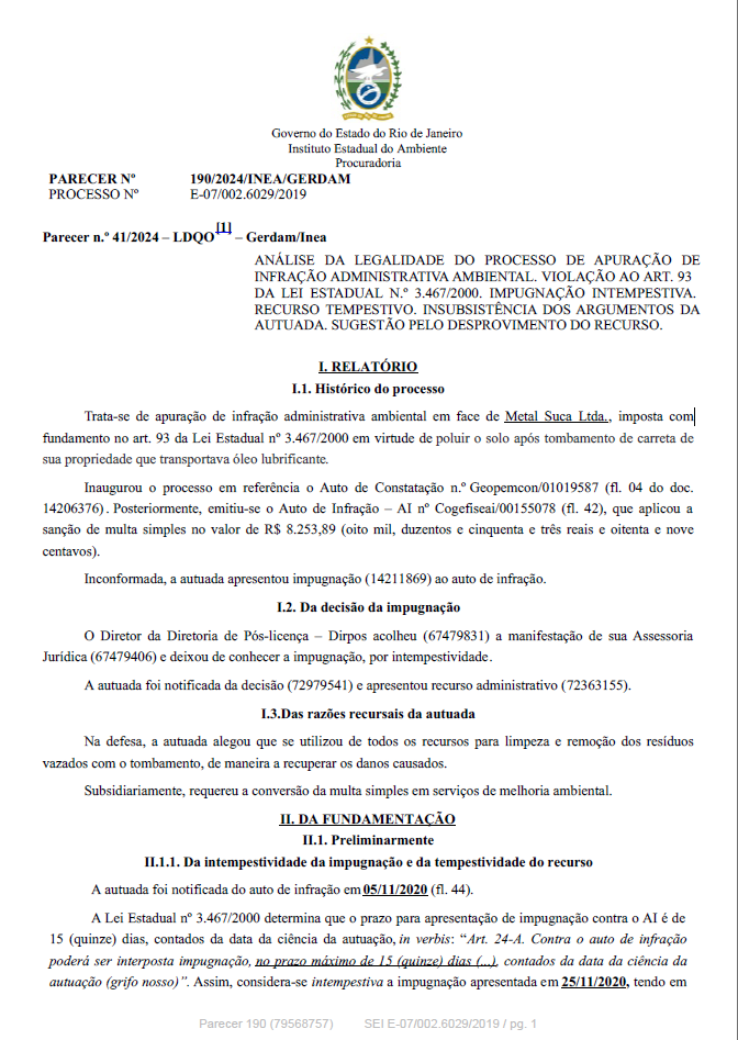 ANÁLISE DA LEGALIDADE DO PROCESSO DE APURAÇÃO DE INFRAÇÃO ADMINISTRATIVA AMBIENTAL. LEI ESTADUAL Nº 3.467/2000. IMPUGNAÇÃO INTEMPESTIVA. RECURSO TEMPESTIVO. PRECLUSÃO DAS ALEGAÇÕES DE DEFESA. CONTROLE INTERNO DE LEGALIDADE. INSUBSISTÊNCIA DOS ARGUMENTOS DA AUTUADA. SUGESTÃO PELO DESPROVIMENTO DO RECURSO E PELA POSSIBILIDADE DE PARCELAMENTO.
