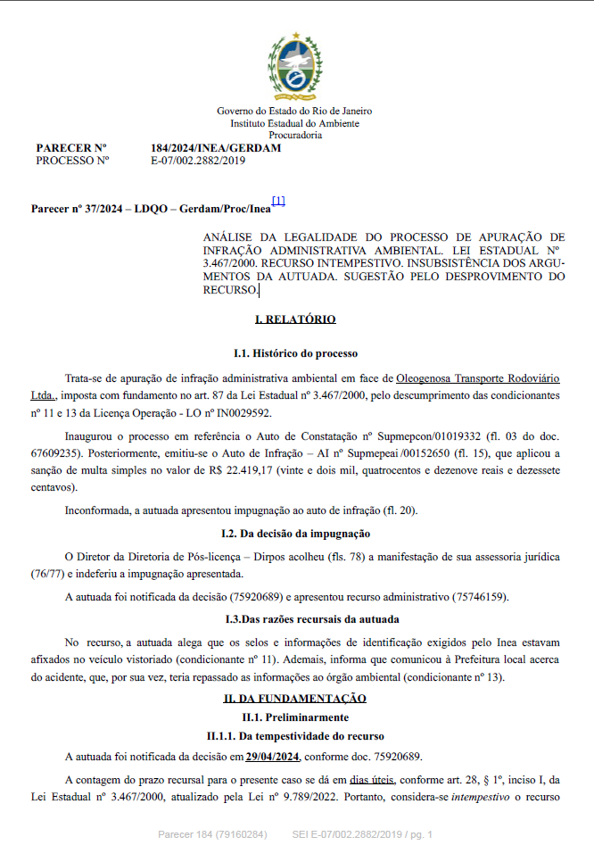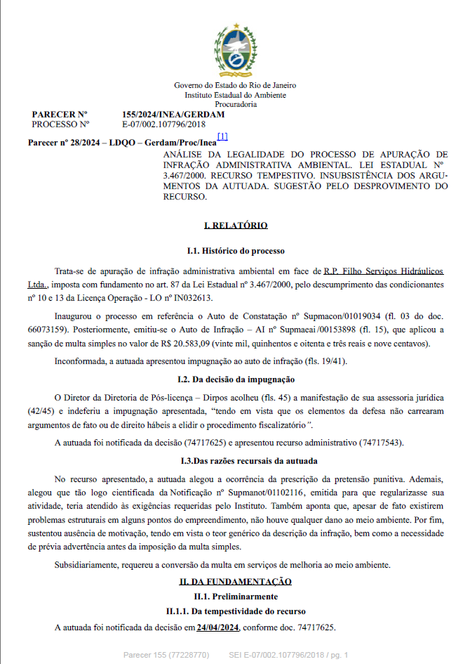 ANÁLISE DA LEGALIDADE DO PROCESSO DE APURAÇÃO DE INFRAÇÃO ADMINISTRATIVA AMBIENTAL. LEI ESTADUAL Nº 3.467/2000. IMPUGNAÇÃO E RECURSO INTEMPESTIVOS. INSUBSISTÊNCIA DOS ARGUMENTOS DA AUTUADA. SUGESTÃO PELO DESPROVI MENTO DO RECURSO.
