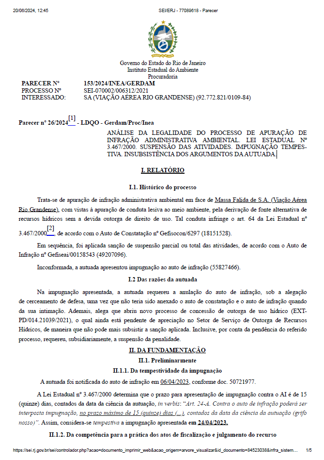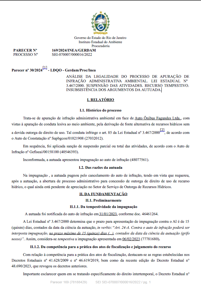 ANÁLISE DA LEGALIDADE DO PROCESSO DE APURAÇÃO DEINFRAÇÃO ADMINISTRATIVA AMBIENTAL. LEI ESTADUAL Nº3.467/2000. SUSPENSÃO DAS ATIVIDADES. IMPUGNAÇÃO TEMPES‐TIVA. INSUBSISTÊNCIA DOS ARGUMENTOS DA AUTUADA.