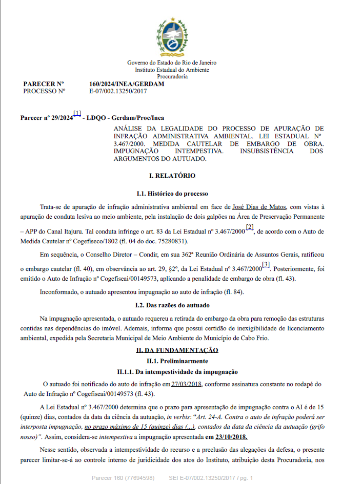 ANÁLISE DA LEGALIDADE DO PROCESSO DE APURAÇÃO DE INFRAÇÃO ADMINISTRATIVA AMBIENTAL. LEI ESTADUAL Nº 3.467/2000. MEDIDA CAUTELAR DE EMBARGO DE OBRA. IMPUGNAÇÃO INTEMPESTIVA. INSUBSISTÊNCIA DOS ARGUMENTOS DO AUTUADO.