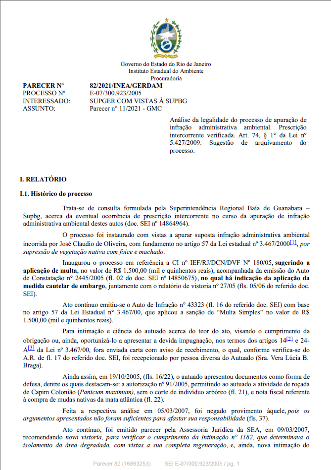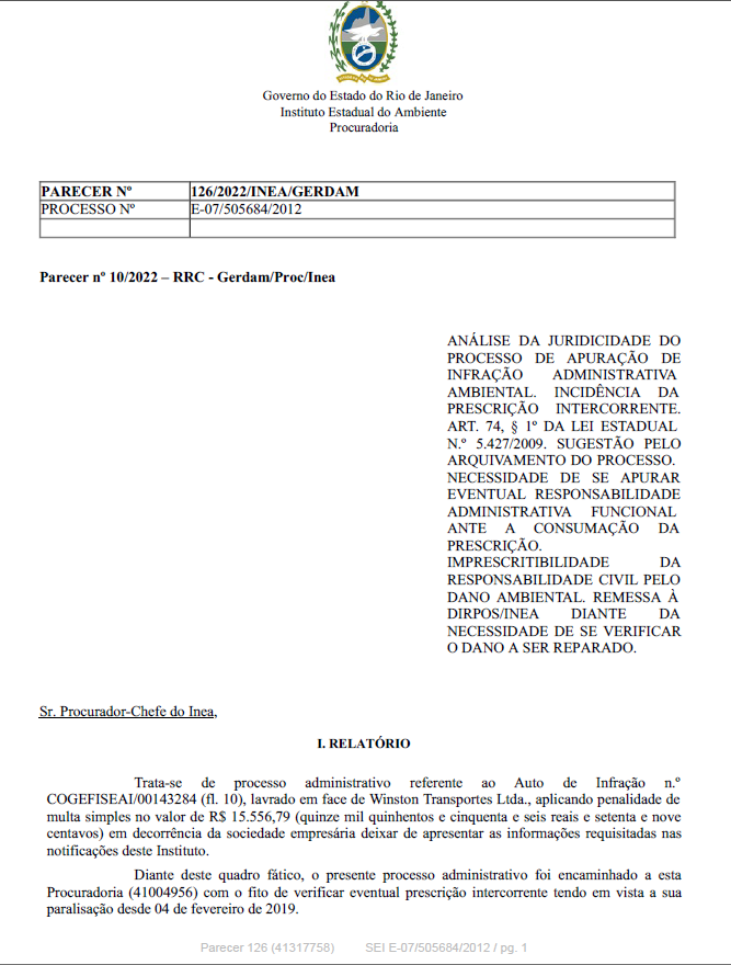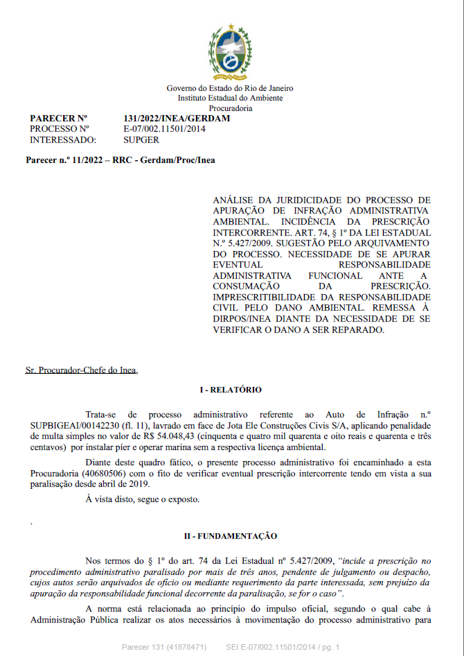 ANÁLISE DA JURIDICIDADE DO PROCESSO DE APURAÇÃO DE INFRAÇÃO ADMINISTRATIVA AMBIENTAL. INCIDÊNCIA DA PRESCRIÇÃO INTERCORRENTE. ART. 74, § 1º DA LEI ESTADUAL N.º 5.427/2009. SUGESTÃO PELO ARQUIVAMENTO DO PROCESSO. NECESSIDADE DE SE APURAR EVENTUAL RESPONSABILIDADE ADMINISTRATIVA FUNCIONAL ANTE A CONSUMAÇÃO DA PRESCRIÇÃO. IMPRESCRITIBILIDADE DA RESPONSABILIDADE CIVIL PELO DANO AMBIENTAL. REMESSA À DIRPOS/INEA DIANTE DA NECESSIDADE DE SE VERIFICAR O DANO A SER REPARADO.