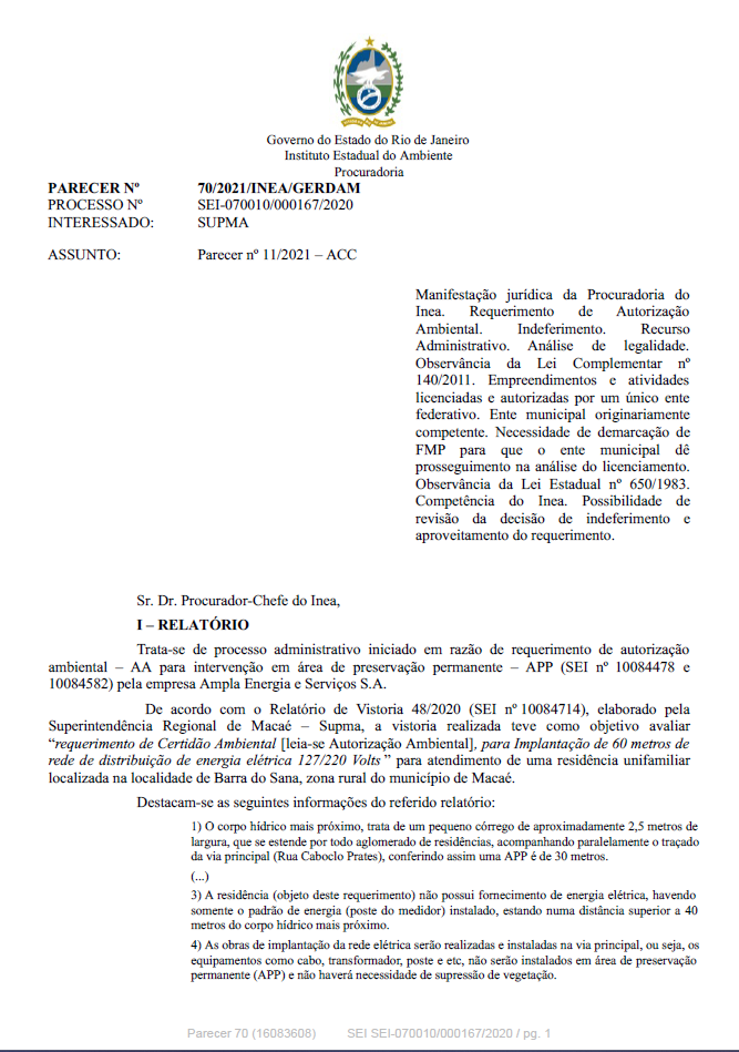 Manifestação jurídica da Procuradoria do Inea. Requerimento de Autorização Ambiental. Indeferimento. Recurso Administrativo. Análise de legalidade. Observância da Lei Complementar nº 140/2011. Empreendimentos e atividades licenciadas e autorizadas por um único ente federativo. Ente municipal originariamente competente. Necessidade de demarcação de FMP para que o ente municipal dê prosseguimento na análise do licenciamento. Observância da Lei Estadual nº 650/1983. Competência do Inea. Possibilidade de revisão da decisão de indeferimento e aproveitamento do requerimento.
