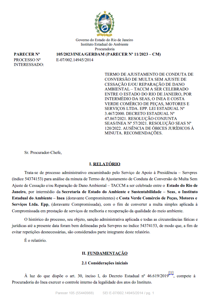TERMO DE AJUSTAMENTO DE CONDUTA DE CONVERSÃO DE MULTA SEM AJUSTE DE CESSAÇÃO E/OU REPARAÇÃO DE DANO AMBIENTAL – TACCM A SER CELEBRADO ENTRE O ESTADO DO RIO DE JANEIRO, POR INTERMÉDIO DA SEAS, O INEA E COSTA VERDE COMÉRCIO DE PEÇAS, MOTORES E SERVIÇOS LTDA. EPP. LEI ESTADUAL Nº 3.467/2000. DECRETO ESTADUAL Nº 47.867/2021. RESOLUÇÃO CONJUNTA SEAS/INEA Nº 57/2021. RESOLUÇÃO SEAS Nº 120/2022. AUSÊNCIA DE ÓBICES JURÍDICOS À MINUTA. RECOMENDAÇÕES.