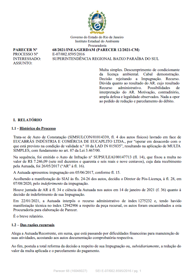 Multa simples. Descumprimento de condicionante da licença ambiental. Cabal demonstração. Decisão rejeitando a Impugnação. Recurso. Dúvida quanto ao resultado do AR. cujo resultado Recurso administrativo. Possibilidades de interpretação do AR. Motivação, contraditório, ampla defesa e legalidade observados. Nada a opor ao pedido de redução e parcelamento do débito.