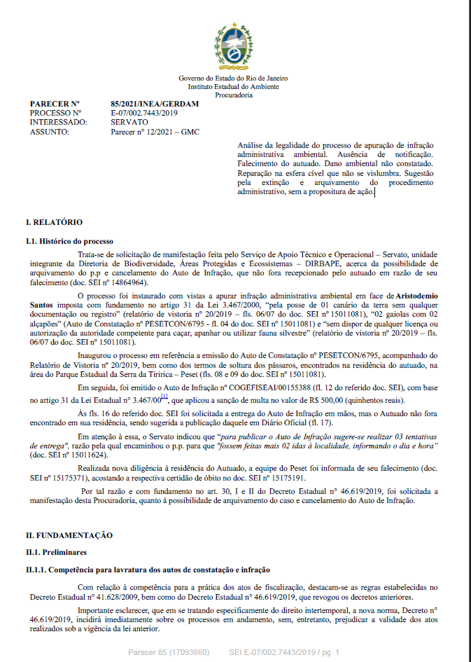 Análise da legalidade do processo de apuração de infração administrativa ambiental. Ausência de notificação. Falecimento do autuado. Dano ambiental não constatado. Reparação na esfera cível que não se vislumbra. Sugestão pela extinção e arquivamento do procedimento administrativo, sem a propositura de ação.