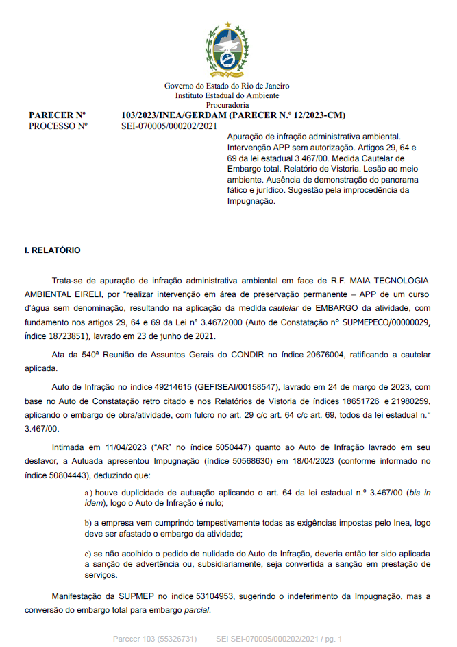 Apuração de infração administrativa ambiental. Intervenção APP sem autorização. Artigos 29, 64 e 69 da lei estadual 3.467/00. Medida Cautelar de Embargo total. Relatório de Vistoria. Lesão ao meio ambiente. Ausência de demonstração do panorama fático e jurídico. Sugestão pela improcedência da Impugnação.