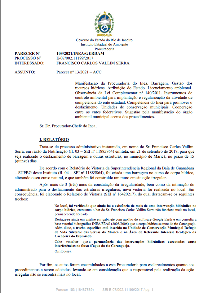 Manifestação da Procuradoria do Inea. Barragem. Gestão dos recursos hídricos. Atribuição do Estado. Licenciamento ambiental. Observância da Lei Complementar nº 140/2011. Instrumentos de controle ambiental para implantação e regularização da atividade de competência do ente estadual. Competência do Inea para promover o desfazimento. Unidades de conservação municipais. Cooperação entre os entes federativos. Sugestão pela manifestação do órgão ambiental municipal acerca dos procedimentos.