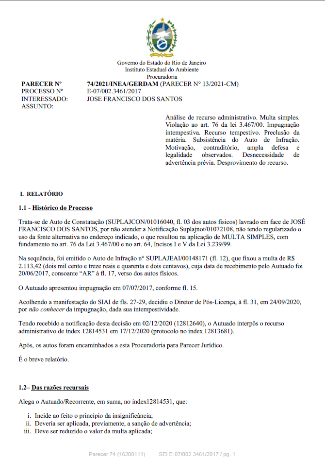 Análise da legalidade do processo de apuração de infração administrativa ambiental. Aplicação de multa decorrente da infração dos artigos 46 e 64 da Lei estadual nº 3.467/00. Sugestão pelo provimento parcial do recurso administrativo.