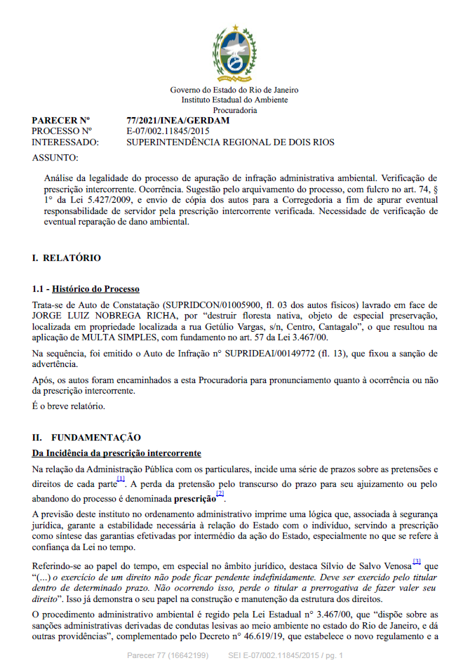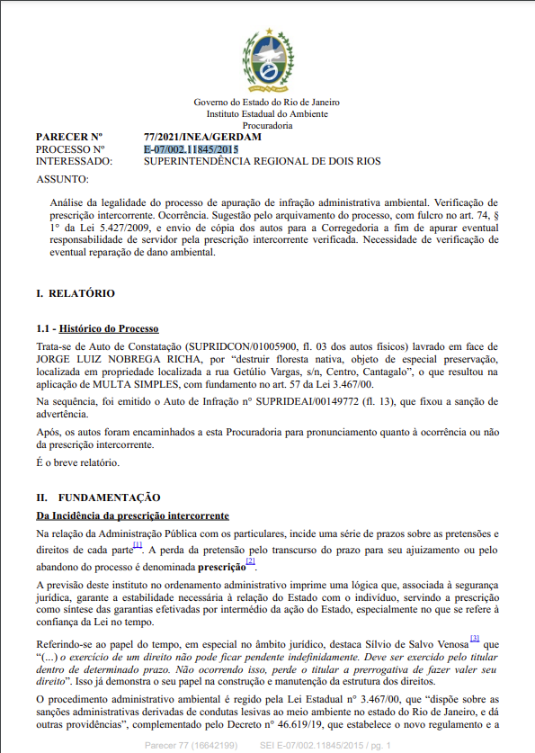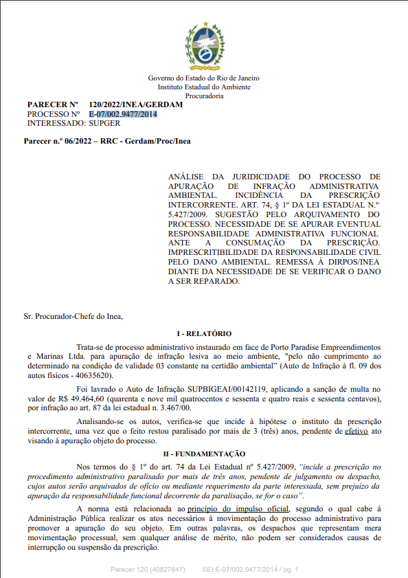 ANÁLISE DA JURIDICIDADE DO PROCESSO DE APURAÇÃO DE INFRAÇÃO ADMINISTRATIVA AMBIENTAL. INCIDÊNCIA DA PRESCRIÇÃO INTERCORRENTE. ART. 74, § 1º DA LEI ESTADUAL N.º 5.427/2009. SUGESTÃO PELO ARQUIVAMENTO DO PROCESSO. NECESSIDADE DE SE APURAR EVENTUAL RESPONSABILIDADE ADMINISTRATIVA FUNCIONAL ANTE A CONSUMAÇÃO DA PRESCRIÇÃO. IMPRESCRITIBILIDADE DA RESPONSABILIDADE CIVIL PELO DANO AMBIENTAL. REMESSA À DIRPOS/INEA DIANTE DA NECESSIDADE DE SE VERIFICAR O DANO A SER REPARADO.