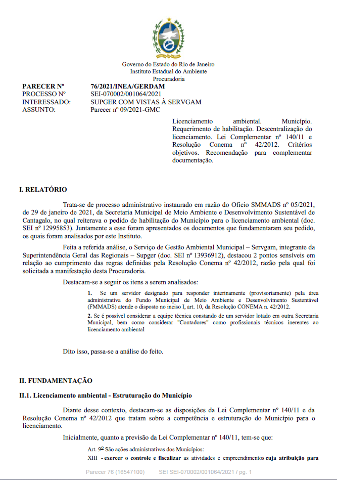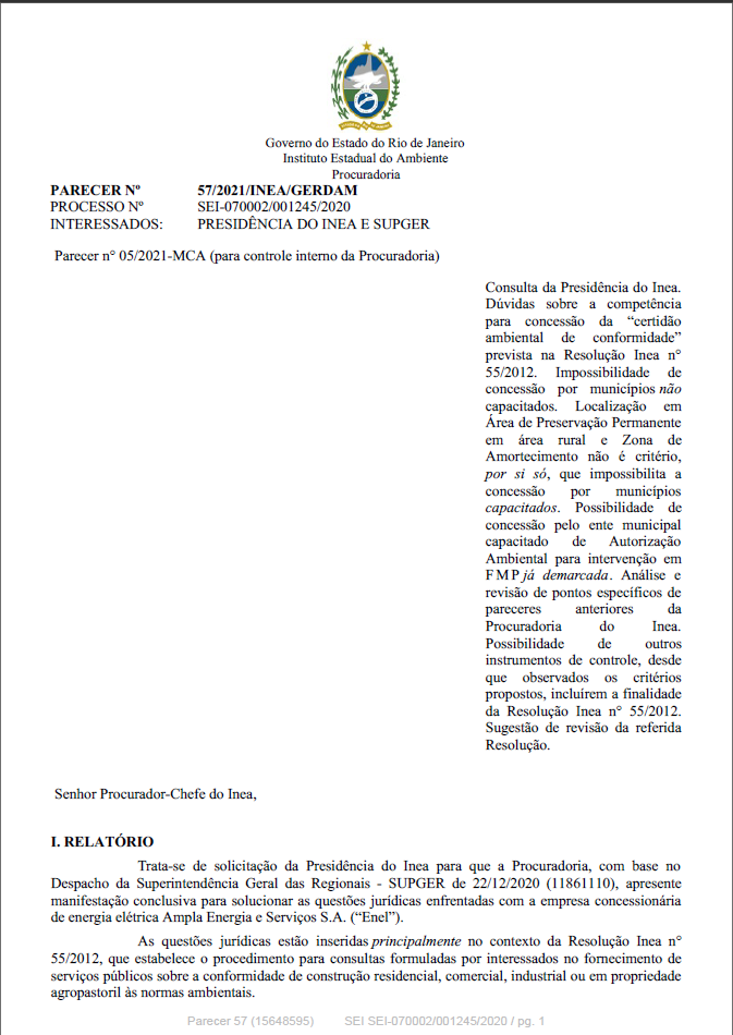Consulta da Presidência do Inea. Dúvidas sobre a competência para concessão da “certidão ambiental de conformidade” prevista na Resolução Inea n° 55/2012. Impossibilidade de concessão por municípios não capacitados. Localização em Área de Preservação Permanente em área rural e Zona de Amortecimento não é critério, por si só, que impossibilita a concessão por municípios capacitados. Possibilidade de concessão pelo ente municipal capacitado de Autorização Ambiental para intervenção em F M P já demarcada. Análise e revisão de pontos específicos de pareceres anteriores da Procuradoria do Inea. Possibilidade de outros instrumentos de controle, desde que observados os critérios propostos, incluírem a finalidade da Resolução Inea n° 55/2012. Sugestão de revisão da referida Resolução. Senhor Procurador-Chefe do Inea, I. RELATÓRIO Trata-se de solicitação da Presidência do Inea para que a Procuradoria, com base no Despacho da Superintendência Geral das Regionais - SUPGER de 22/12/2020 (11861110), apresente manifestação conclusiva para solucionar as questões jurídicas enfrentadas com a empresa concessionária de energia elétrica Ampla Energia e Serviços S.A. (“Enel”). As questões jurídicas estão inseridas principalmente no contexto da Resolução Inea n° 55/2012, que estabelece o procedimento para consultas formuladas por interessados no fornecimento de serviços públicos sobre a conformidade de construção residencial, comercial, industrial ou em propriedade agropastoril às normas ambientais. Parecer 57