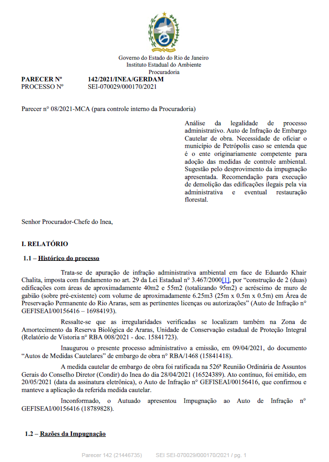 Análise da legalidade de processo administrativo. Auto de Infração de Embargo Cautelar de obra. Necessidade de oficiar o município de Petrópolis caso se entenda que é o ente originariamente competente para adoção das medidas de controle ambiental. Sugestão pelo desprovimento da impugnação apresentada. Recomendação para execução de demolição das edificações ilegais pela via administrativa e eventual restauração florestal. Senhor Procurador-Chefe do Inea, I. RELATÓRIO