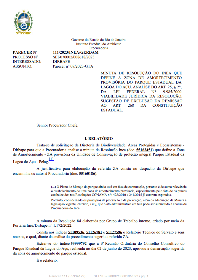 MINUTA DE RESOLUÇÃO DO INEA QUE DEFINE A ZONA DE AMORTECIMENTO PROVISÓRIA DO PARQUE ESTADUAL DA LAGOA DO AÇU. ANÁLISE DO ART. 25, § 2°, DA LEI FEDERAL N° 9.985/2000. VIABILIDADE JURÍDICA DA RESOLUÇÃO. SUGESTÃO DE EXCLUSÃO DA REMISSÃO AO ART. 268 DA CONSTITUIÇÃO ESTADUAL.