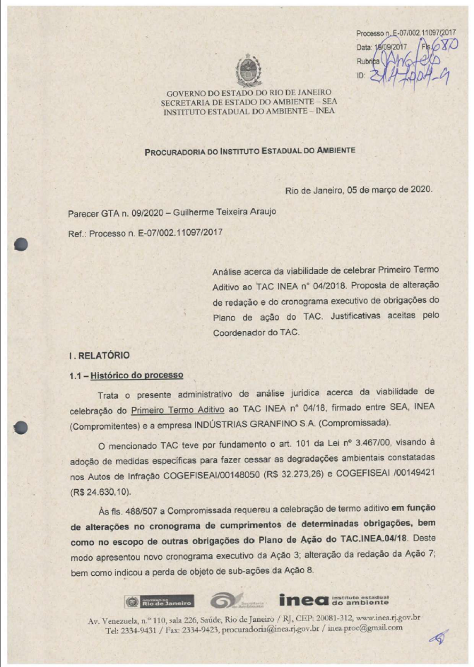 Análise acerca da viabilidade de celebrar Primeiro Termo Aditivo ao TAC INEA n° 04/2018. Proposta de alteração de redaçãp e dp cronograma executivo de obrigações do Plano de açâo do TAC. Justificativas aceitas pelo Coordeador do TAC